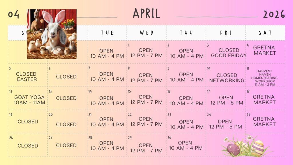 Need a break from the hustle and bustle? Cajun Corral Farm is thrilled to offer Goat Therapy twice a month for guests 16 years and older. Come relax, unwind, and share your worries with our gentle and understanding goats—we promise, they’re excellent secret-keepers! Bring a blanket or a chair, something to drink, and let the peaceful presence of these loving animals help you welcome serenity, calm, and joy back into your life. At just $25 per person, this one-of-a-kind experience is a steal!